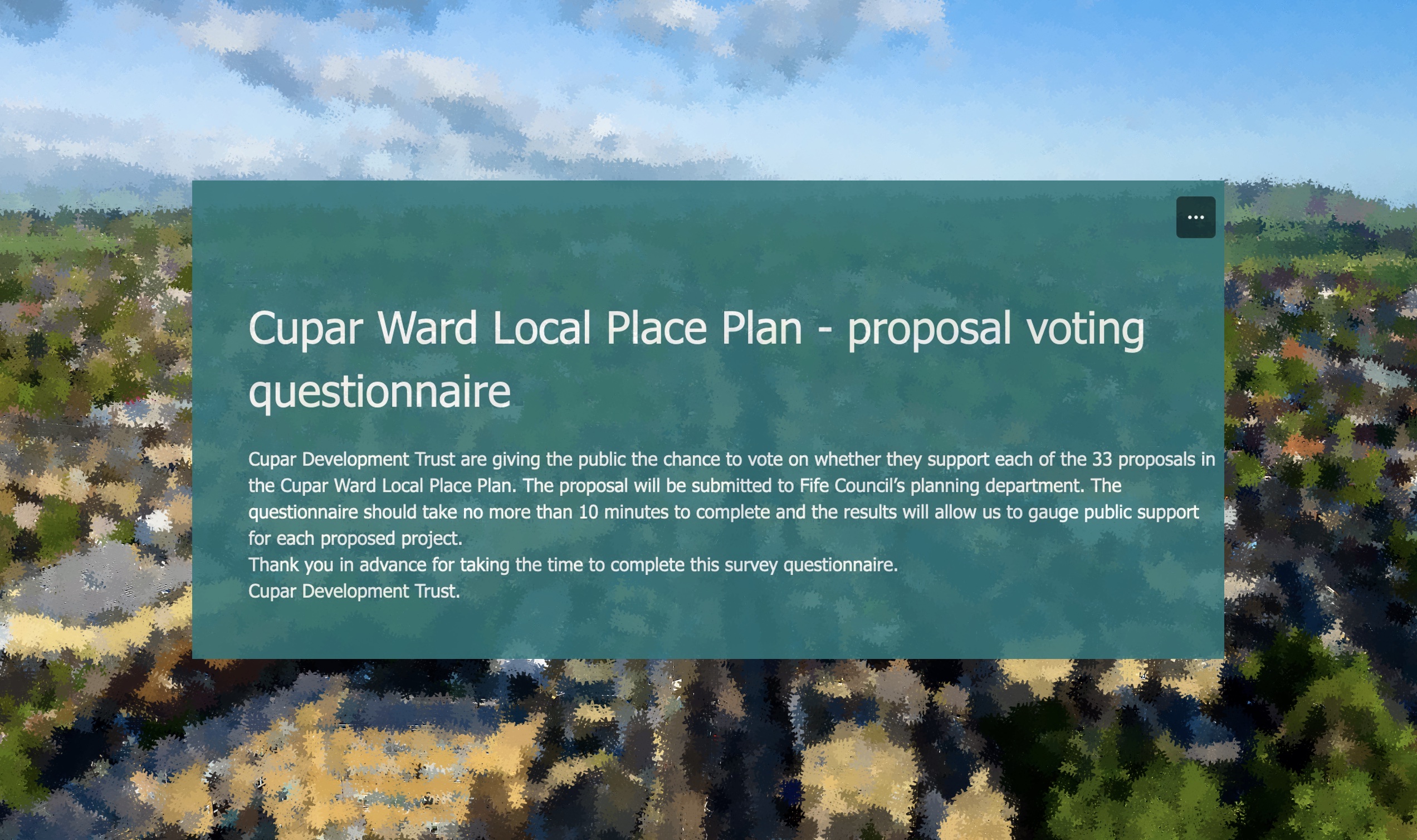 However, before the Cupar Ward Local Place Plan is submitted, the Trust is asking for your input … to help demonstrate local support: to this end, CDT has created a short questionnaire that allows you to vote on each of the proposals. It takes no more than 10 minutes to complete.