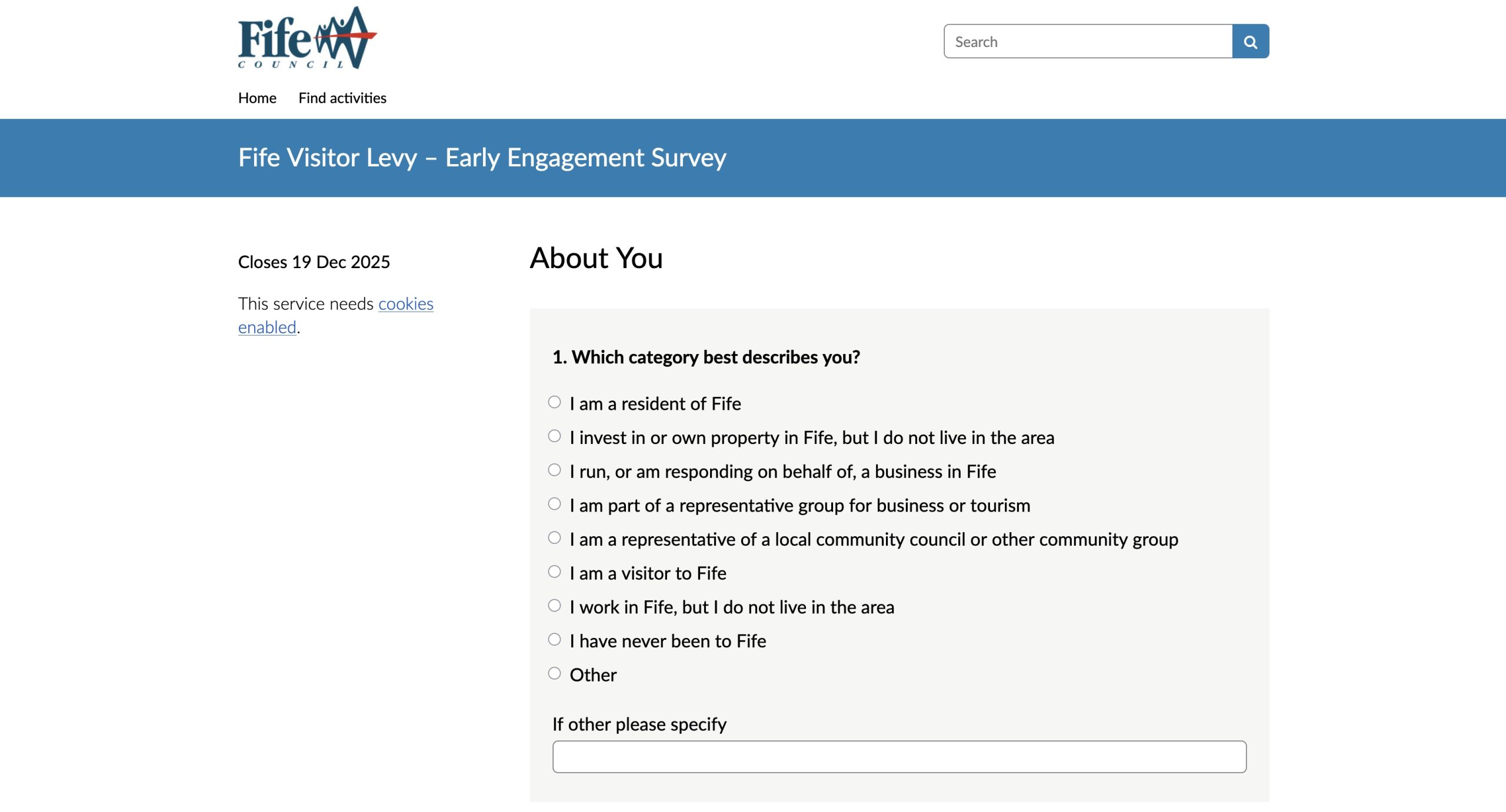 Fife Council want to know whether a Visitor Levy should in fact be introduced, and who you think the levy should apply to, where you think any funds raised could have the biggest impact, and how the impact of the levy scheme should be monitored. All are asked to “take the time to complete the online survey and/or come along to the drop-in engagement events“.