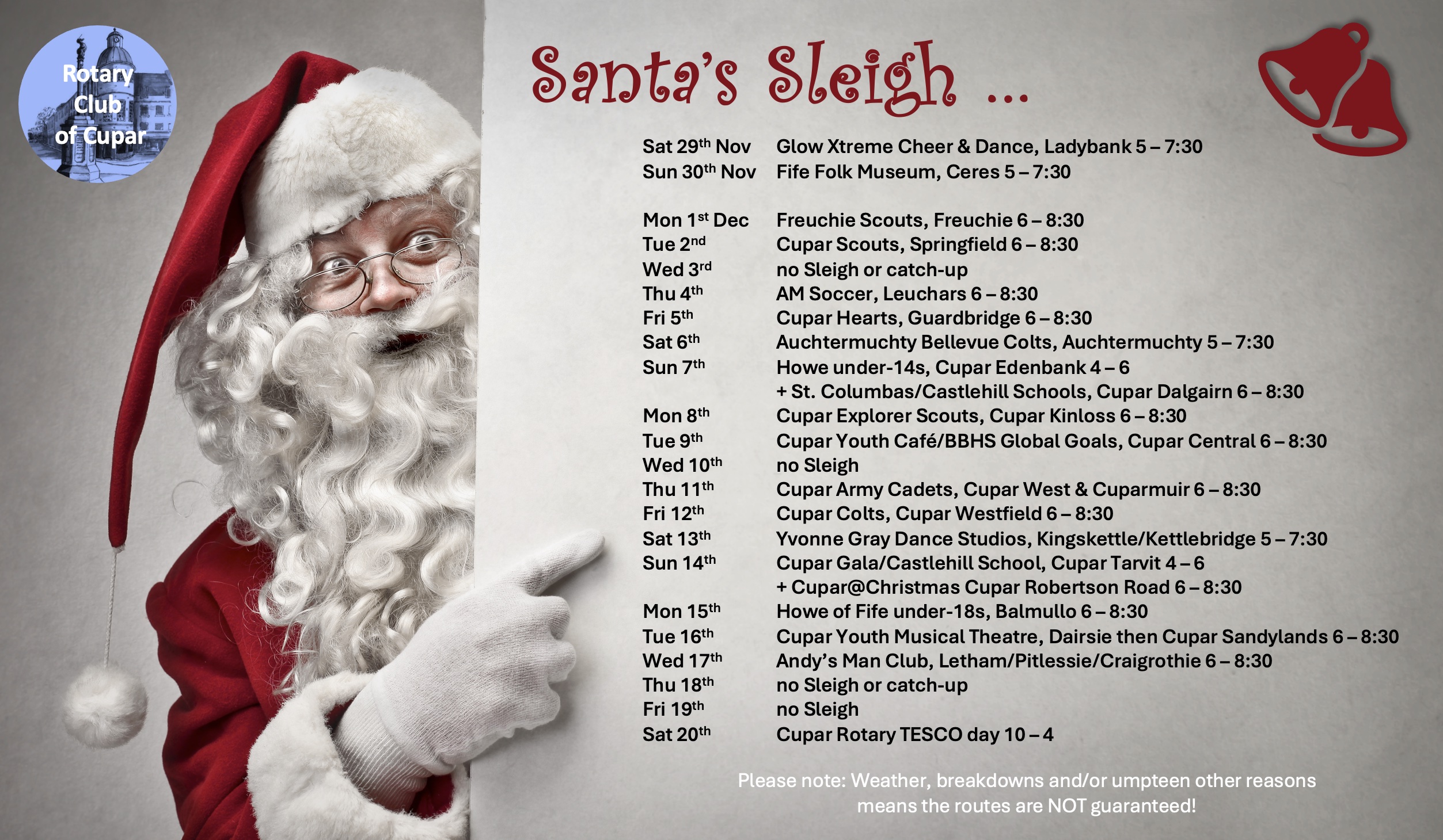 The Rotary Club of Cupar is back with their much-loved Santa’s Sleigh – helping to raise funds for Cupar Food Bank and Age Concern Cupar. They will be visiting destinations across north Fife before the big day. Organisers stress that “weather, breakdowns and/or umpteen other reasons means the routes are NOT guaranteed” but they will do their very best to cover as many areas as possible.