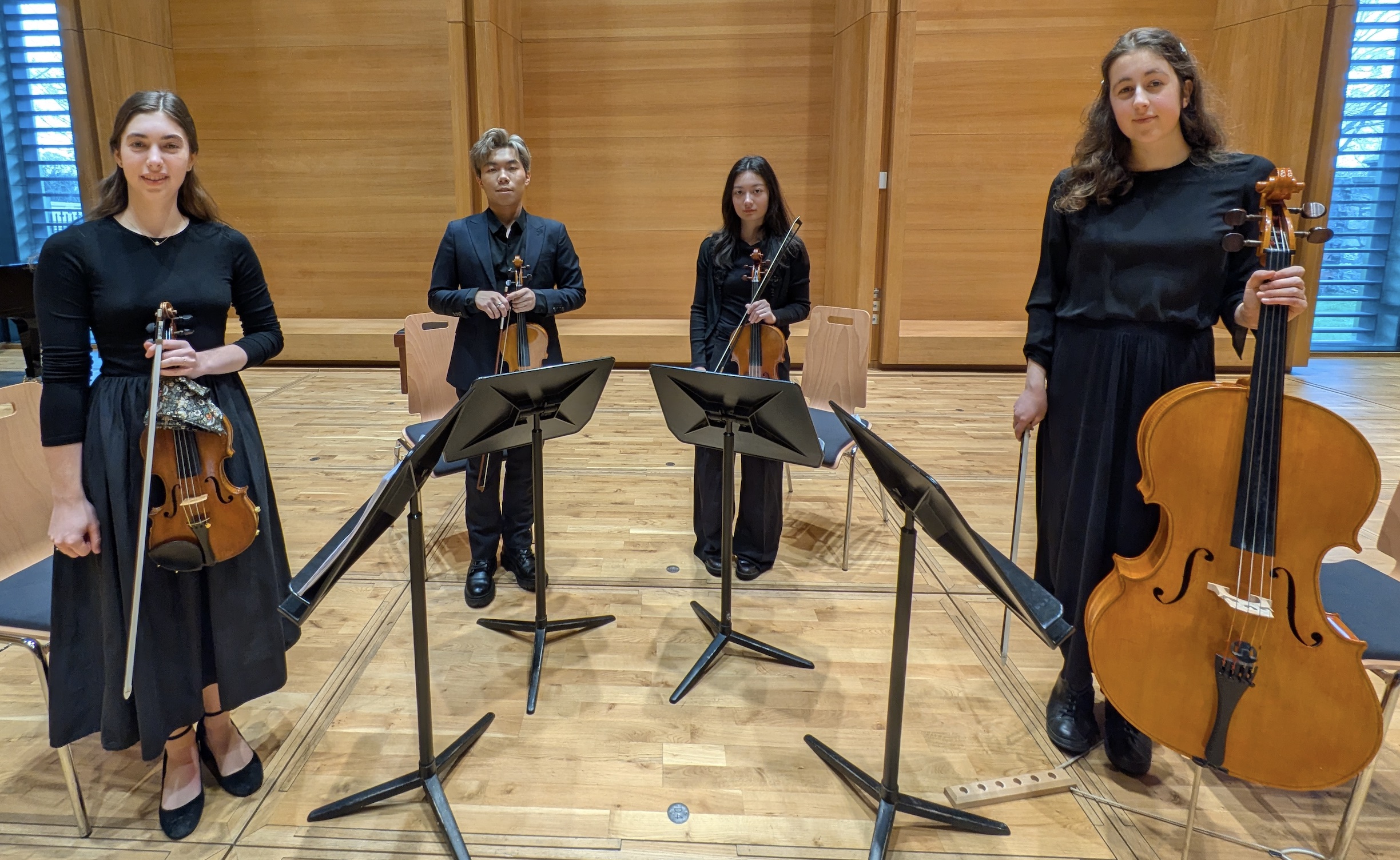 The Quartet – one of three scholarship quartets made up of auditioned students at the University of St Andrews Music Centre, where they receive weekly individual and ensemble coaching – is pictured below (L-R): Amelie Bazile, Marcus Chan, Marie-Liang Ingrand, Roshni Bhaumik.